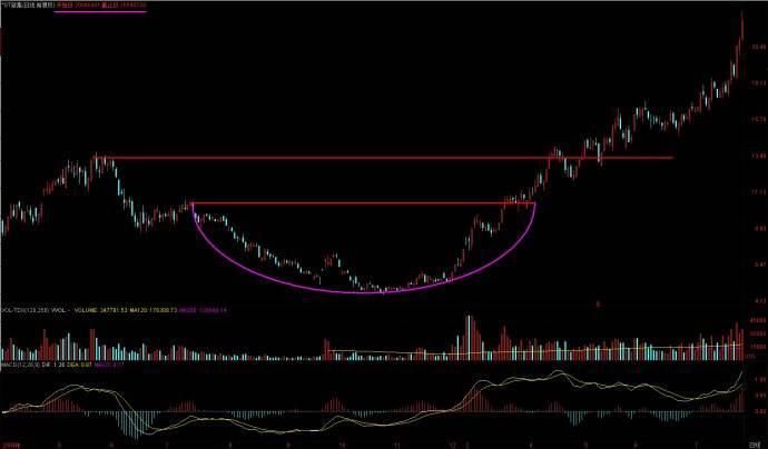 在下跌之后出现企稳,在底部位置形成一个圆弧形的底部形态,在此期间往往成交量都不会太大,而一旦出现成交量逐步放大,就是我们买进的时候。