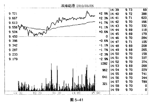 例如,滨海能源( 000695)(如图5-41 ),在分时走势中,股价开盘后义无反顾地震荡盘上,不顾大盘的下跌.放量上涨,这对主力来说是兵家大忌,但该股已营造了一个星期的价涨量增的标准圆弧底,此时已到了不得不涨的时候。
