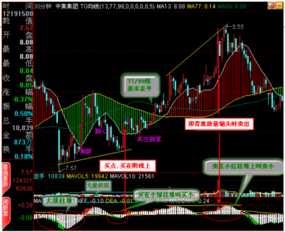 总结如下:上升通道中缩量买入股票,放量卖出(不含底部放量) ;5、10 日均线死叉之后缩量买入股票,金叉后放量卖出股票。在30分钟走势图中13 线为波,77, 99线为段。看‘段’打‘波’,也叫看长打短,高抛低吸。不要轻易放弃这只票,直到77,99线这个段在高位走平了为止。大海涨潮时,一浪推一浪。退潮时,一浪压一浪。 浪为波,潮为段。