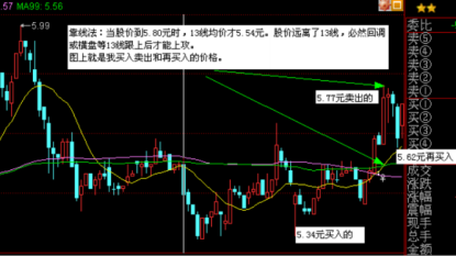 前面讲的是, 股价突然上涨但离77, 99线一手指左右,离三手指那就不叫靠线,那就应卖出了,这就是“三指卖出法”、“指”是指的手指,用手指到走势图去量,股价距离77, 99线3个手指那么远就要卖了(指30分钟走势图)。靠线法是指靠13线。