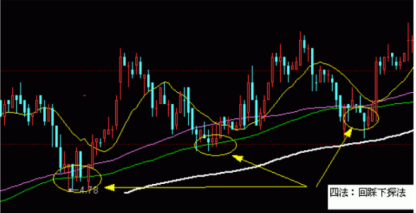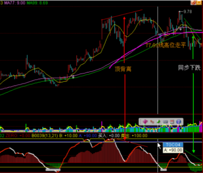 当30分钟图77,99线走平上翘,股价上涨了一定幅度后,又下跌到77,99线或跌破77,99线,但77,99线必须保持上翘,这时可极积买入股票。就是股价下探回踩77,99线就叫“回踩下探法”。注意30分或60分图77线和99线走平就获利了结。