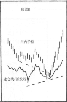 那么你需要比较一下哪只股票的建仓力度更大。做法很简单,观察两只股票的背离情况。如果一支股票的价格走势与建仓/派发线呈现出最大限度的背离,那么这只股票就是你的最佳选择。