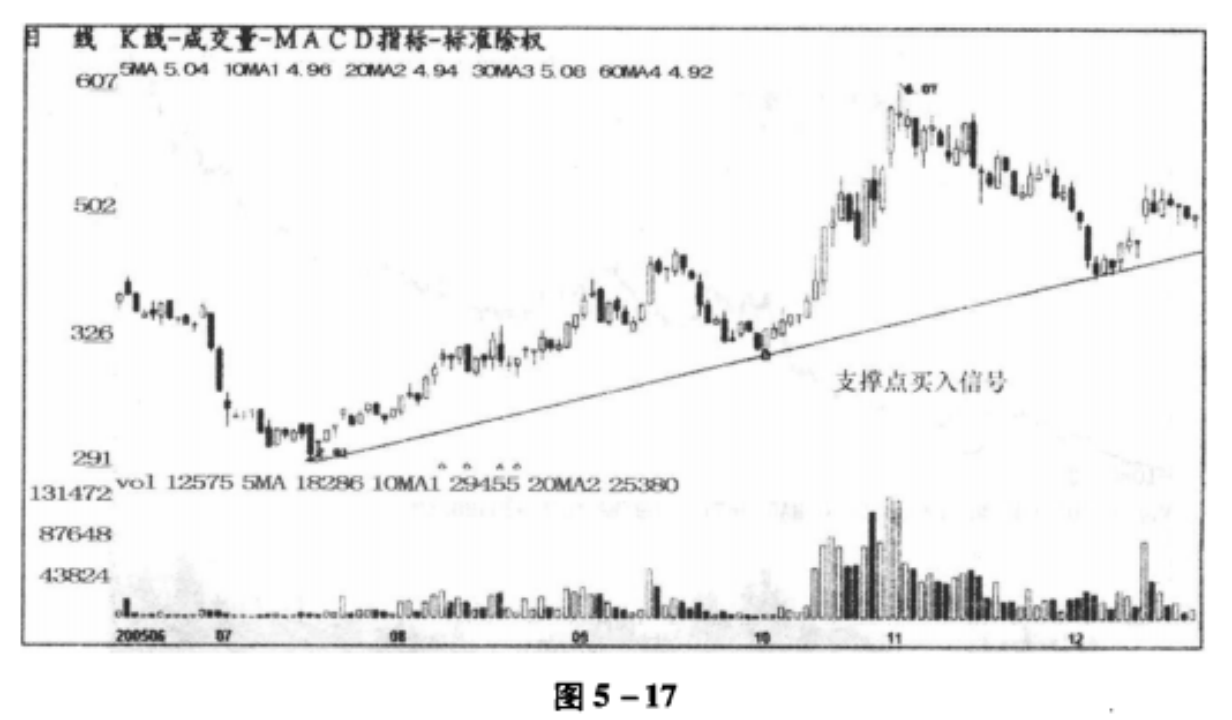 如图5-17,东北高速2005年7月见底2.91元后开始上涨,底部不断抬高。将4. 80元与首次回调的低点3.80元连线形成上升趋势线,在其后调整至该线的4.70元、4.80元均获得支撑并再度上行,而成为短线的买人时机,止损点可设在跌破支撑线之时。
