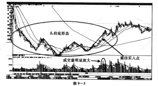 如图9-3所示的K线底部形态之头肩底形态: