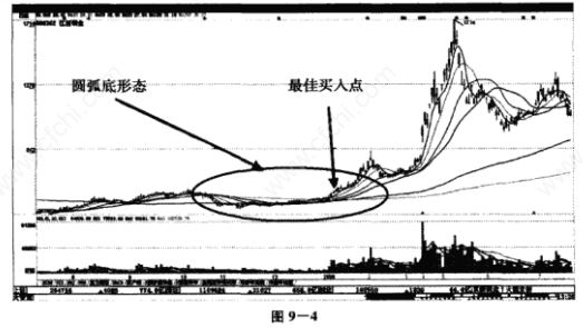 如图9-4所示,该股在股价处于低位区域时出现了圆弧底形态的走势。