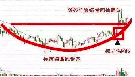 圆弧底是重要的反转信号,形成的时间一般较长,容易辨认。一旦出现了圆弧底形态的特征,通常便是市场的底部。圆弧底形态通常是大型投资机构吸货区域,由于其炒作周期长,故在完成圆弧底形态后,涨升的幅度也是惊人的。