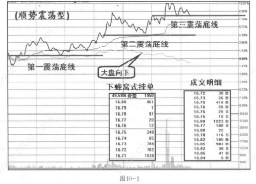 此种类型的震荡走势,可分为顺势震荡型(震荡的节奏与大盘同步)和逆势震荡型(震荡的节奏与大盘相反)两类。我们先看顺势震荡型,见图10-1。