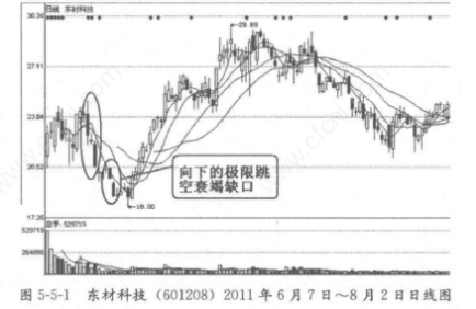 在股价持续下跌的过程,如果出现了加速大阴线而且累计了许多大阴线,那么就可以买最后的极限阴线,标志就是地量和“向下的极限跳空衰竭缺口”出现。衰竭缺口出现,预示着行情不久将反转,在下跌中出现极限的跳空下跌一衰竭缺口, 大底部也就出现,可以买入。