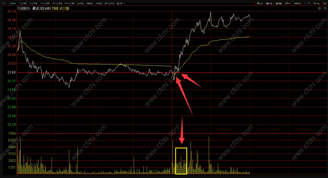 股价低开,之后十分钟左右分时阳量持续放大,突破昨日收盘线(箭头所指区域)时形成天量、大量的阳量,并且出现了双底情况,后马上拉升爆出大阳线!确认出现底部快速回升走势。