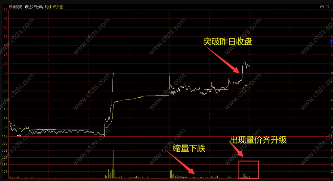 只不过,在以同花顺为代表的炒股软件中,出现量价齐升形态时,分时量柱表现为黄