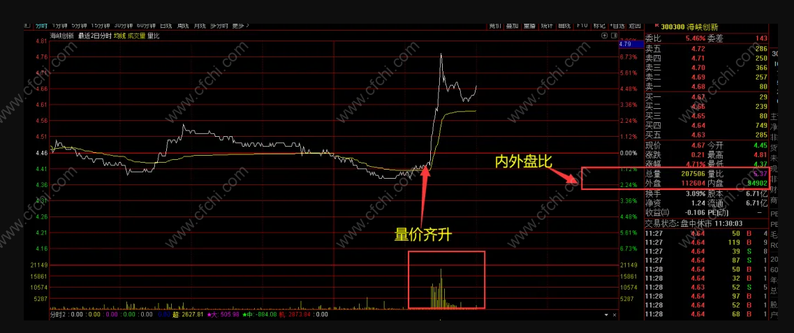 右侧盘口外盘始终大于内盘的数量,说明市场资金是以挂高价买人的方式纷纷买人股票,市场热度极高。