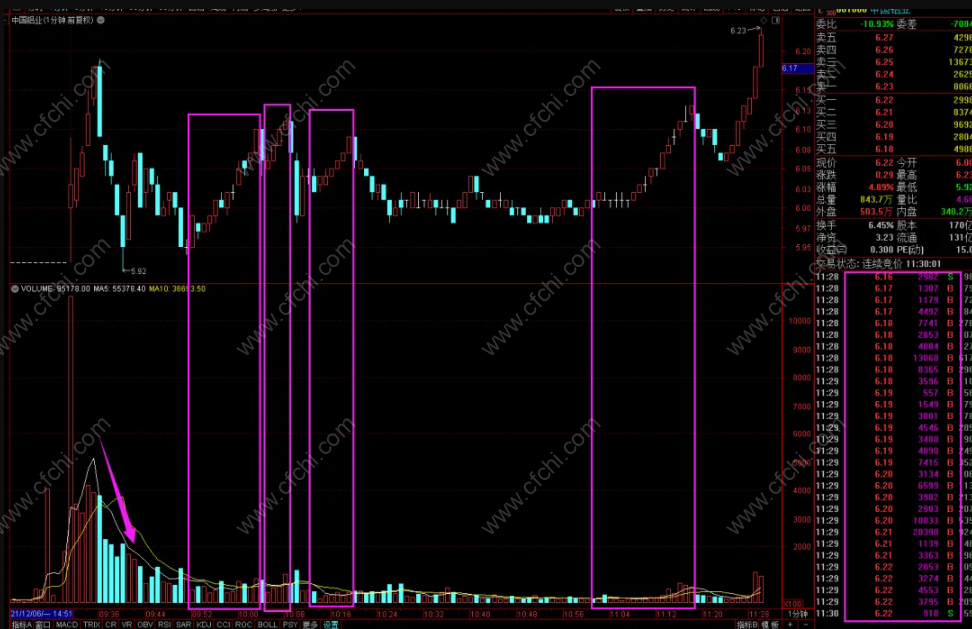 今日案例:中国铝业601600 早盘冲高下跌,之后9:52分,之后开始进入大单,注意下图第一个紫线圈区域,