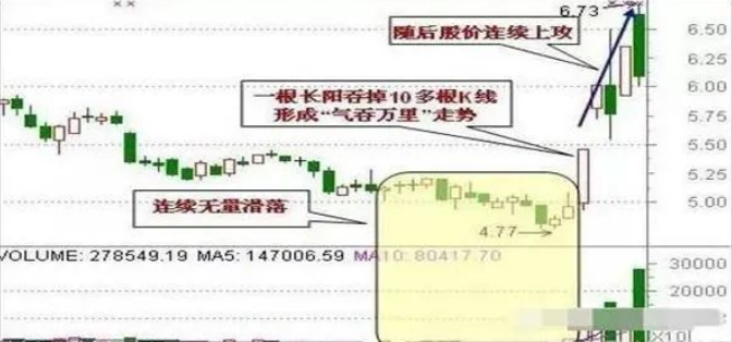 股价在低档持续小幅无量滑落,某一日正常开盘后拔地而起,报收大洋心啊,统吃此前近10根K线,成交量亦放出巨量。