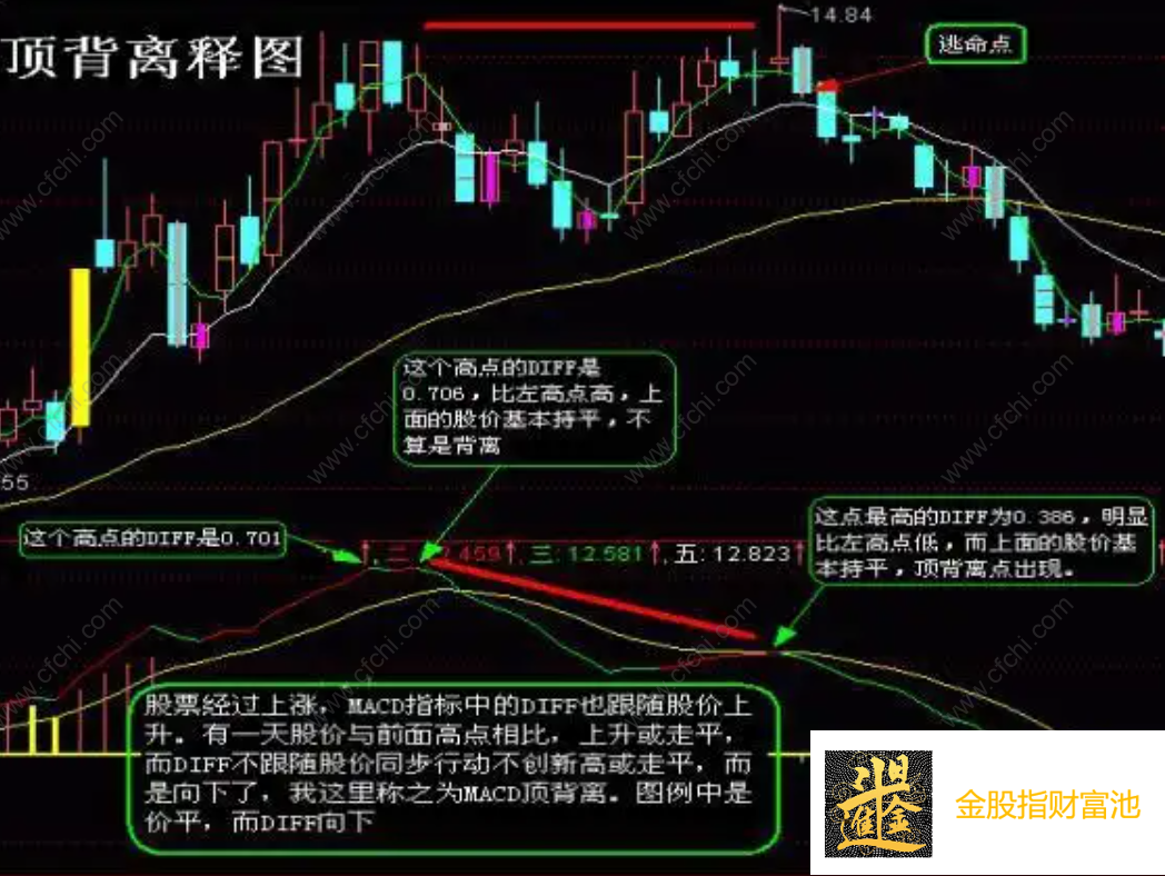 1、当 股价 K 线图上的股票走势一峰比一峰高,股价一直在向上涨,而 MACD 指标图形上的由红 柱构成的图形的走势是一峰比一峰低,即当股价的高点比前一次的高点高、而 MACD 指标的 高点比指标的前一次高点低,这叫顶背离现象。顶背离现象一般是股价在高位即将反转转势的信号,表明股价短期内即将下跌,是卖出股票的信号。