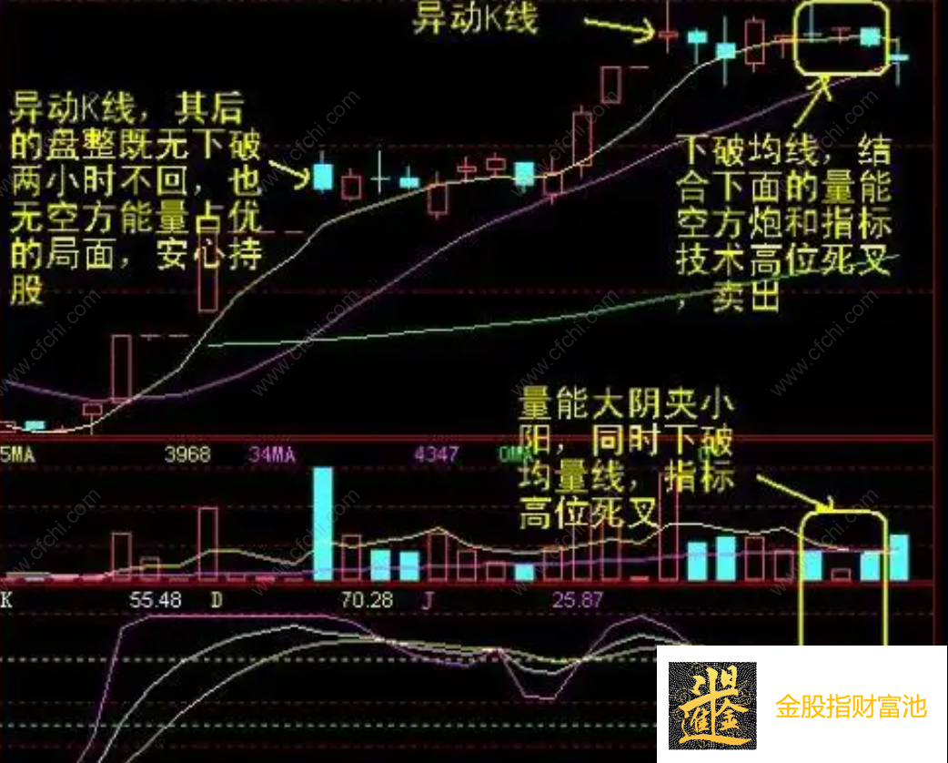 2、从 60分钟的角度,对短线卖出做一定程度的把握。上涨阳量大于下跌阴量,我们称为良性量能,当某小时上涨阳量小于下跌阴量,同时随后出现的下跌阴量仍然在放 大时,显示多空力量开始转化,空方占优,同时价格跌破5单位均线,指标在技术高位死叉,为卖点。我们取个简单而形象的名字“能量空方炮”。