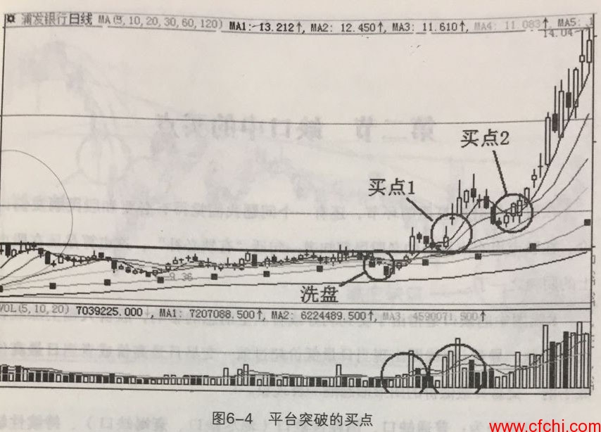 图6- 4是浦发银行2014年8月至12月的K线走势。该股的股价在9.5~ 10元的区间平台整理了3个月。最后在经过深度洗盘后,该股以一一根中阳线突破平台整理,成交量放大。在图中,我们可以看到在突破后就以4根小阴线的方式又一一次洗盘,伴随的是缩量,并没有跌穿有压力线转化而来的支撑线,随后股价继续上攻。消大股价在支撑线上方没有跌穿支撑线并获得支撑,回头向上时就构成了一个很好的买点,而图6-4中买点2的获得是由均线的支撑获得的。当然我们也可以在突破时的中阳线顶部画上一根支撑线,此支撑同样有效。