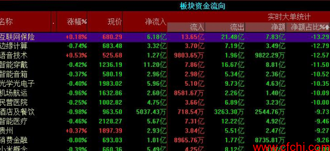 8个板块主力净流出占比超10%,互联网保险主力净流出7.83亿,主力净流出占比13.29%;边缘计算主力净流出3.49亿,主力净流出占比12.79%;智能穿戴主力净流出8.81亿,主力净流出占比11.50%;光学光电子主力净流出4.63亿,主力净流出占比10.35%。