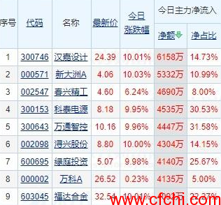 两只涨停股新大洲A和汉嘉设计主力净额超5千万;同样涨停收盘的科泰电源(300153)、万通智控(300643)主力净额超4千万,主力净额占比超30%。