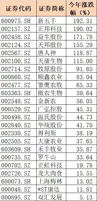 个股的表现中,最猛的是新五丰,今年涨近200%