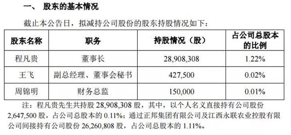 3月19日晚间,正邦科技宣布,董事长程凡贵、董秘王飞和财务总监周锦明加入减持队伍,未来6个月内将抛售大约88万股。其中,程凡贵减持不超过 661,875 股,王飞减持不超过 106,875 股、周锦明减持不超过 10,000 股。减持原因是股东自身资金使用需求。