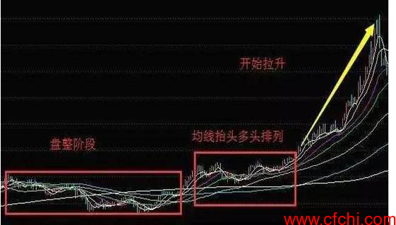 从上图可以看出,股票经过几个月的盘整后出现抬头,成交量放大,一般表示主力吸筹阶段,而这个阶段我们不选择介入,可以看线乱不看,形乱不买,均线系统寻求翻倍大牛股,而第二个阶段均线有所抬头,系统开始走向多头排列阶段,此为建仓期,一般中线,收益颇高,吸筹时间越长,爆发力度越强,卖出时间点可看均线股票买卖口诀:三线顺上不做空,三线顺下不做多。