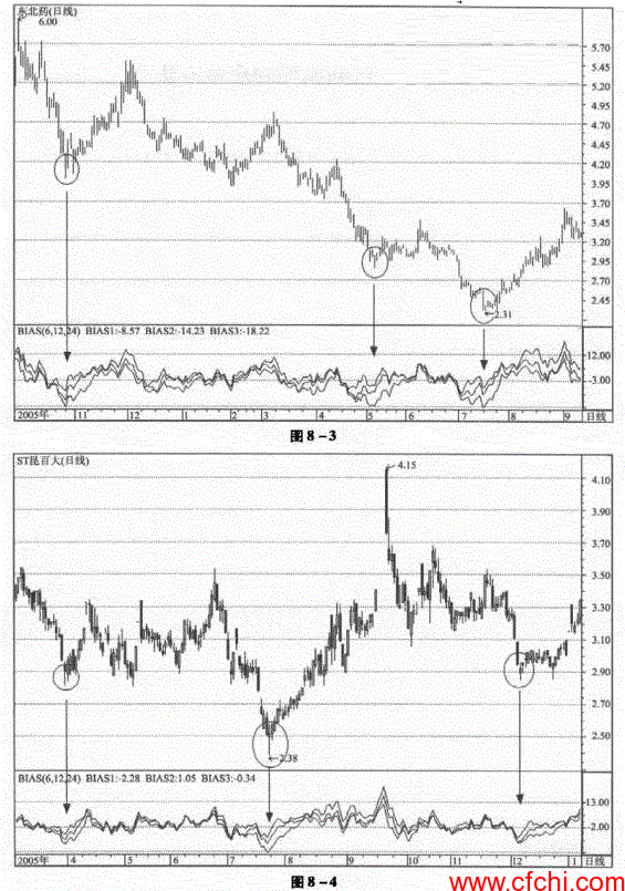 例如:东北制药(行情 研报)(000597), 每当该股的24日BIAS 小于-17时,往往能产生一段反弹行情(见图8-3)。