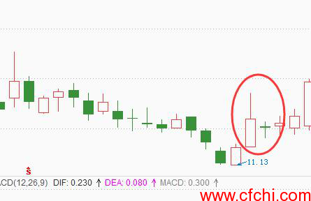 8、长上影阳线,也叫流星线,实体较短,上影线较长,无下影线或只有很短的下影线。该图线与上吊阳线的性质一样,若处在高价位,是行情见顶的信号,应卖出股票;若处在低价位,则是行情见底的信号,可考虑买入股票。