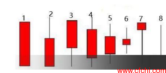这种形态出现在下跌走势中,由两根K线组成。第一根K线实体较长,第二根K线实体较小,且被包括在第一根K线实体之内。两根K线的颜色有没有限制。
