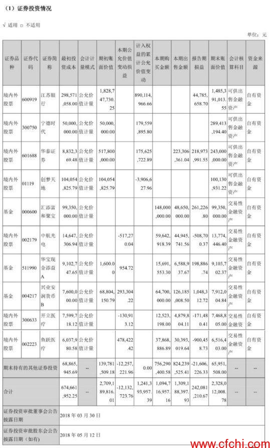 而业绩暴增的主要原因是:公司持有的江苏银行、华泰证券、宁德时代等股票类金融资产产生的公允价值变动收益,使公司一季度“躺赚”3.1亿元!