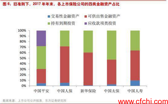 不光是中国平安,由于保险公司持有大量的“可供出售的金融资产”,会计准则的变更对利润表的影响都将是巨大的。东方证券的统计显示,根据5家上市保险公司的2017年年报,在旧会计准则的四分类金融资产中,占比最大的就是“可供出售金融资产”,平均占比49%,而“交易性金融资产”的平均占比仅4%。而在新金融工具会计准则下,大量“可供出售的金融资产”将归入FVPL,公允价值的变动将直接影响当期损益。
