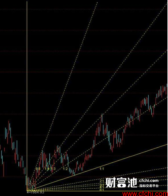 四、最后,江恩角度线还有一种画法,被称为零位角度线,角度线起点位置都在纵坐标的0上,在横坐标上选取重要的高点和地点横坐标保持相同。这种方法尝尝会让我们有意外的惊喜,可惜的是在软件中纵坐标没办法显示为0,所以这里就不再截图显示。