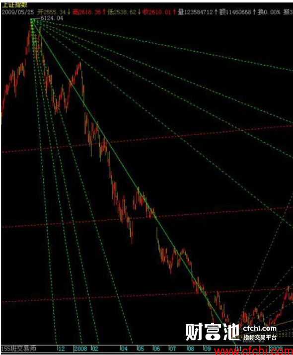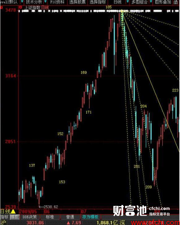 图中黄色的线段是从1664.93这个重要低点开始,经过2008年12月31日的重要低点1814.75点;绿色角度线以3478.01波段高点为起点,经过2009年9月18日的3068.03点的重要高点;红线也用相同的方法。从图中我们可以看出,3478的高点在无限接近黄线的1:3线后转向,2009年的11月24日的高点3361.39点刚好在黄线的1:2线附近转向,与此同时,这个地方也正好受到绿线的8:1线压制。目前指数已经跌破了红线的1:1重要支撑,下一步如果想要大涨,就必须收复红线1:1线,从图中看大约在3100附近。