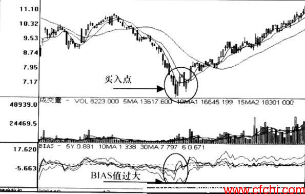 如上图,股价经过一轮暴跌后,远离移动平均线,5日BIAS超过-10, 10日BIAS达到-17点以上,30日BIAS达到-28点以上,这时5日与10日的BIAS差值超过7点,10日与30日的BIAS差值达11点,5日与30日的BIAS差值达18点,可见股价严重超跌,BIAS指标值偏大,股价有回归0值的要求,是短线入市机会,此后该股走出一波反弹行情。