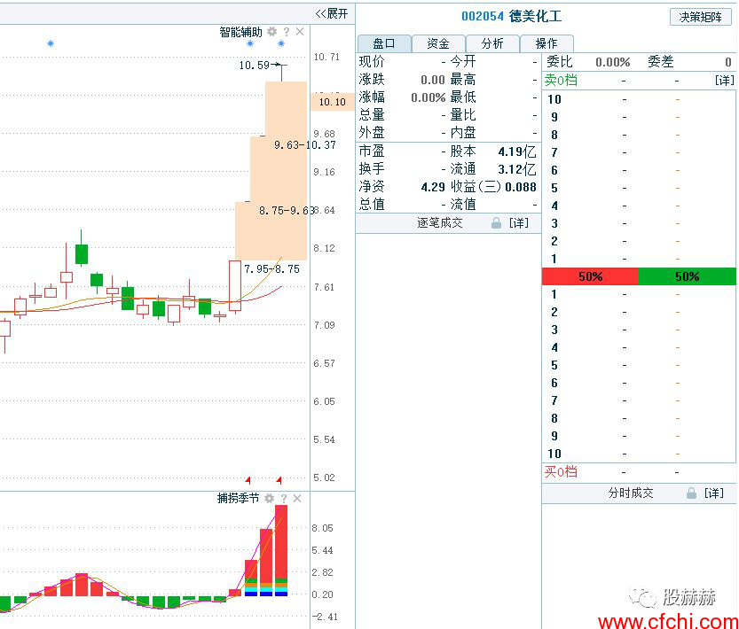 德美化工:氢能源+创投+石油化工+猪肉,4连板,近期的热点基本都有,是今日高位股留下的唯一活口。尾盘恐慌开板,炸板之后的放量回封是可以考虑接力的。明日还有冲高预期,要博的话最好低吸参与。如果有早盘竞价5个点以下预期差的低吸机会可以低吸大长腿涨停。稳健的作为情绪标就好。