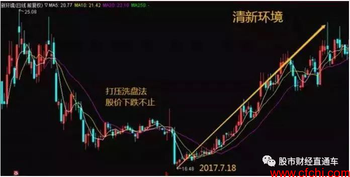 打压洗盘法是庄家最常用的方法之一。在一段时期内,由于股价下跌不止,散户一般会逐渐陷入恐慌,交出筹码。打压洗盘一般出现在股价有所上升之后,用这种方法洗盘对庄家实力要求也较高。投资者应该在确定打压洗盘时清仓观望,等待拉升时再入场。