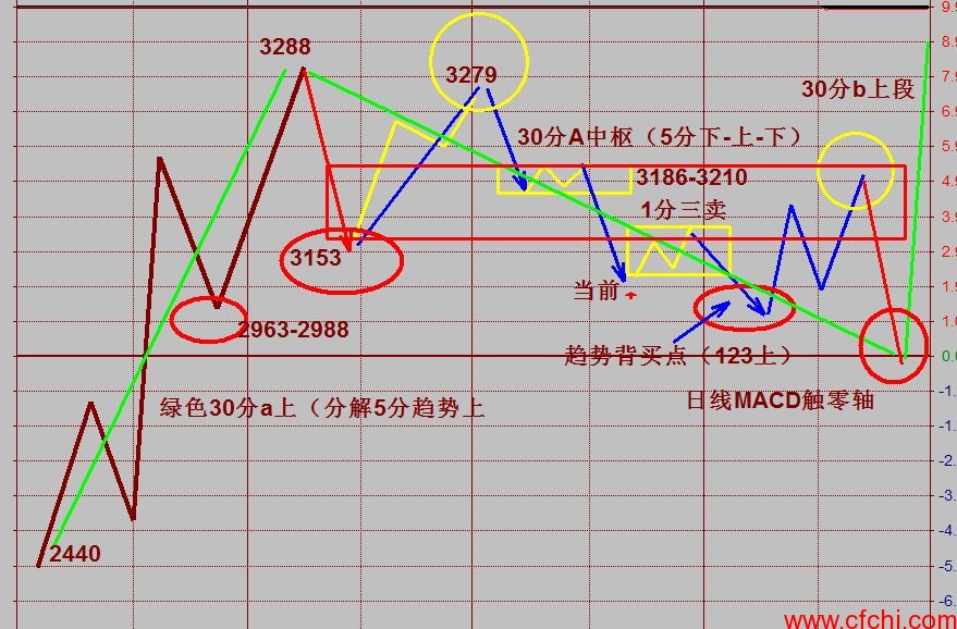 【趋势下】3279开始的1分a+A(3186-3210)+b非背下 待b末端买点和B中枢三卖(不重叠3186点)+c背驰下买点。如图。