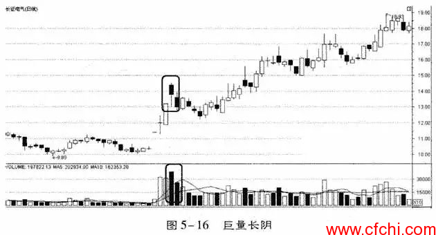 (1)在庄家洗盘阶段,K线组合往往是大阴不断,并且收阴的次数多,且每次收阴时都伴有巨大的成交量,好像庄家正在大肆出货,其实不然,仔细观察一下就会发现,当出现以上巨量大阴时,股价很少跌破10日移动平均线,短期移动平均线对股价构成强大支撑,庄家低位回补的迹象一目了然.这就是技术人士所说的“巨量长阴价不跌,主力洗盘必有涨”(图5-16)。
