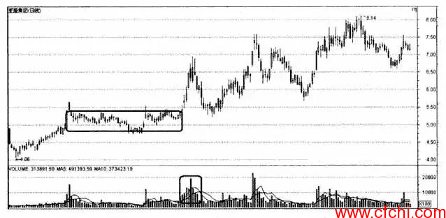 (5)从K线组合来看。K线组合会构成一个明显的箱体,股价在这个箱体中波动的频率开始加大,通常股价上涨时成交量放大,而股价下跌时成交量明显萎缩。