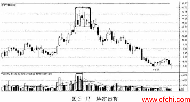 (4)最后拉高时。最后拉高的目的是为了出货。拉高最主要的特点是涨幅不大(图5-17)。如果涨幅过大。出货的人会比较多。即便此时涨幅比较大。它的成交量也是非常小的。显示筹码锁定在庄家手中。拉高成本不大。涨幅大了之后。向下的杀跌空间比较大。容易出货。判断庄家是在最后拉高还只是在中期的再次拉高。关键看涨幅。再就是看成交量。如果在高位拉高但没有成交量。投资者则可以基本放心;如果拉高的幅度很小且成交量大。这就是出货的征兆。投资者就要准备抛出股票。