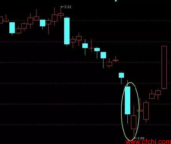 3.先是一根中阴线或长阴线,接着是一根跳空低开的中阳线或大阳线。