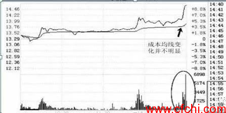 在某些时候,大盘环境不理想,市场信心不足,个股的走势全天盘整,多空平衡。而主力筹码已经吃足,不想把廉价筹码再让予他人,要急于启动行情,快速脱离成本区,则尾盘的刻意往上拔高,能人为地制造日K线图上的大阳线,显示做多信心。