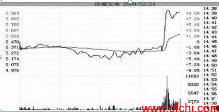 庄 股涨到一定的程度,获利盘太多了需要洗盘以清洗浮筹。如果这个时候主力既要杀出恐慌的效果,又不想杀得太深,以免被人抢走廉价筹码,怎么办?自然是先拉上 去再杀下来,但如果在盘中拉升,由于获利盘已经盈利较多了,会在拉升过程中不断抛售,正常的拉升费力不讨好。此时主力如果选择尾盘急拉上去,且在次日低开低走,甚至直接杀一个跌停板,股价会跌得不深且效果又不错。如图1-8所示,西藏发展在2009年2月24日尾盘拉涨停,随后开始了大幅 度的洗盘。
