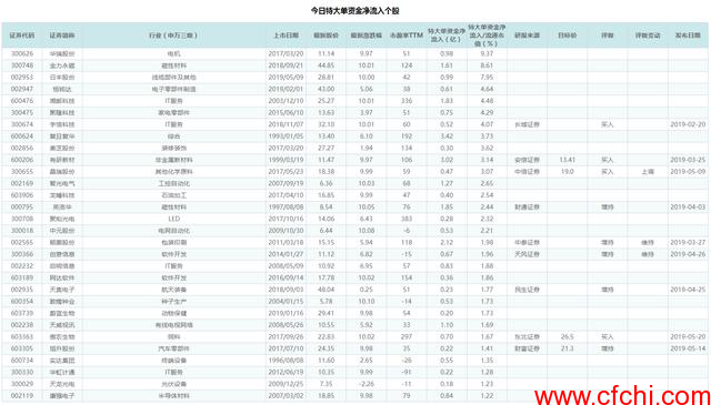 我们按照特大单资金的净流入/流通市值从大到小排序,列出了净流入/流通市值最大的30只股票:
