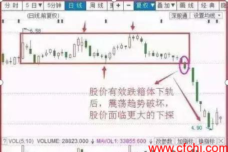 如上图所示,股价在经历较长时间的箱体盘整后,实体阴线跌穿下方平台支撑,震荡箱体遭受了破坏,股价将面临新一轮的下探。