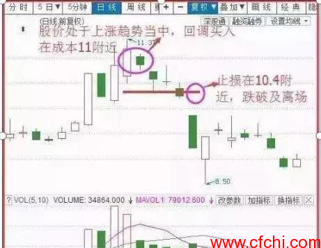 如上图,股价处于放量上涨的趋势当中,追高买入在11块附近,此时要带好止损比如10.4,如果后期跌破止损位,就说明自己趋势判断失误,果断止损纠正错误以免更大的损失。