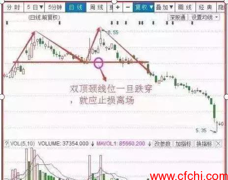 如上图,双顶形成后,跌穿颈线就要果断出局,以免后期更加被动。