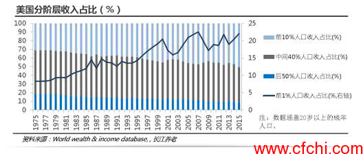 1975-2015年的40年间,美国前1%的人口占据全社会总收入的比重从9%上升至22%,贫富差异显著扩大。