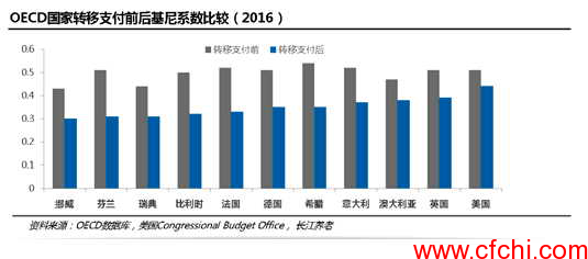 从各主要OECD国家的经验来看,在转移支付前,衡量收入不均的基尼系数指标比较高,甚至高于美国,但通过转移支付再分配之后,基尼系数都显著低于美国。