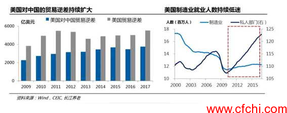 美国多年持续贸易逆差,制造业就业持续低迷。普通民众支持特朗普贸易保护政策的重要原因,是不断扩大的贸易赤字,与产业向外迁移导致的低迷不前的制造业就业。