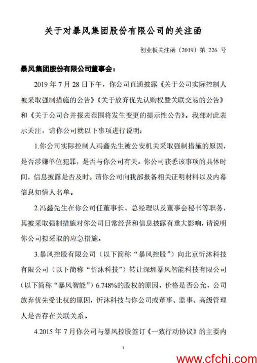 7月29日,深交所发布《关于对暴风集团股份有限公司的关注函》(创业板关注函〔2019〕第226号)。这份发给暴风集团董事会的函件称,7月28日下午,暴风集团披露《关于公司实际控制人被采取强制措施的公告》《关于放弃优先认购权暨关联交易的公告》和《关于公司合并报表范围将发生变更的提示性公告》。深交所创业板公司管理部对此表示关注,请暴风集团就7类事项进行说明: